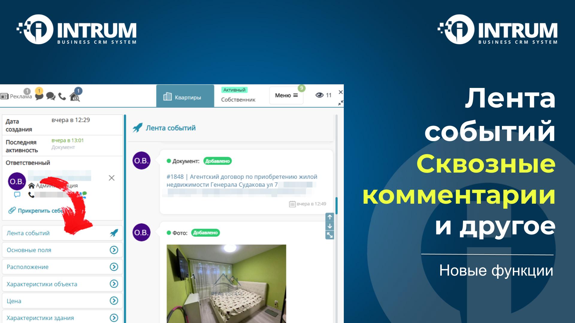 В системе INTRUM очередные обновления: новая лента событий в карточке Объекта, Заявки и Контакта, сквозные комментарии и много другое...