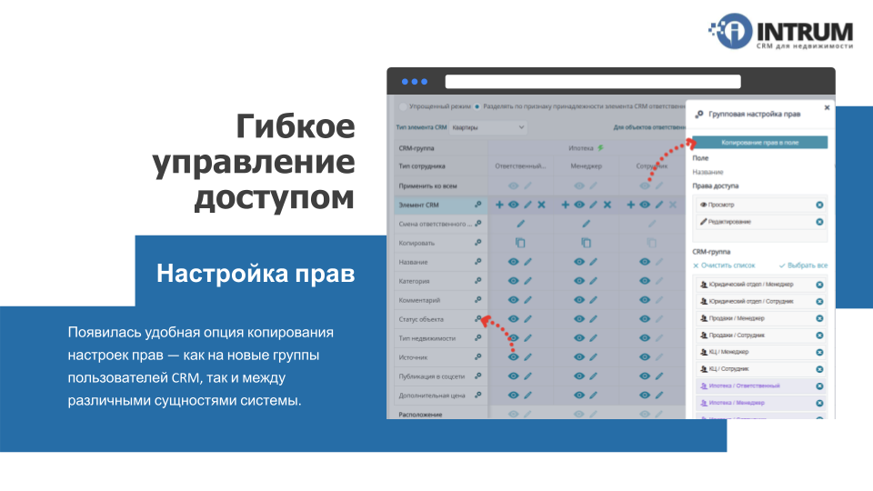 Гибкое управление доступом: Появилась удобная опция копирования настроек прав — как на новые группы пользователей CRM, так и между различными сущностями системы.