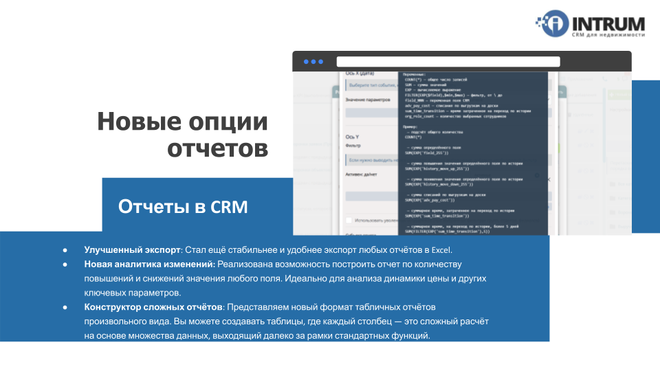 Конструктор сложных отчётов: Представляем новый формат табличных отчётов произвольного вида. Вы можете создавать таблицы, где каждый столбец — это сложный расчёт на основе множества данных, выходящий далеко за рамки стандартных функций. Например, детальная аналитическая карточка для объектов в выборке.