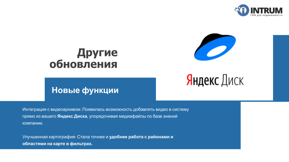 Интеграция с видеоархивом: Появилась возможность добавлять видео в систему прямо из вашего Яндекс.Диска, упорядочивая медиафайлы по сделкам и объектам.