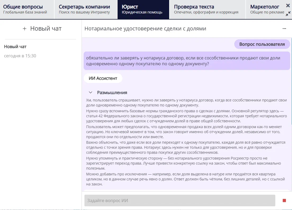 Следующая вкладка — «Ассистент — Юрист». Здесь вы можете задавать любые юридические вопросы в сфере недвижимости: правовые последствия при покупке доли, нюансы регистрации перехода права, требования к предварительному договору, проверка чистоты сделки. Бот отвечает на основе актуального законодательства.