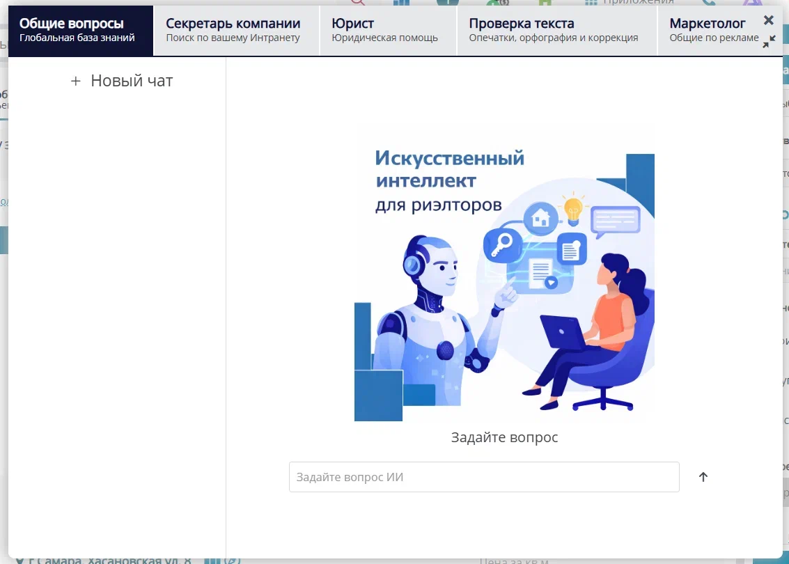 Первая вкладка — «Ассистент по общим вопросам». Этот бот использует глобальную базу данных по всем тематикам, связанным с недвижимостью и смежными областями. Он отвечает на типовые вопросы, на которые не нужно обращаться к внутренним документам компании.