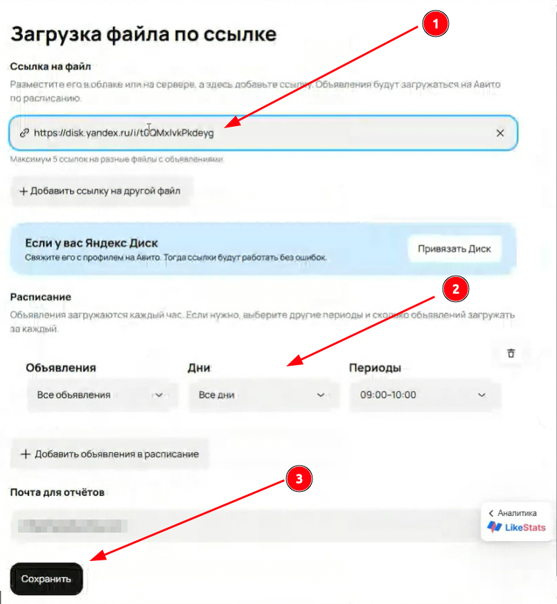 Кроме того, необходимо указать максимальное количество объявлений, которые можно загрузить за час. В этом поле рекомендуется указывать число, превышающее количество публикуемых объявлений, чтобы Avito могла опубликовать все новые объекты с учетом обновляемых.