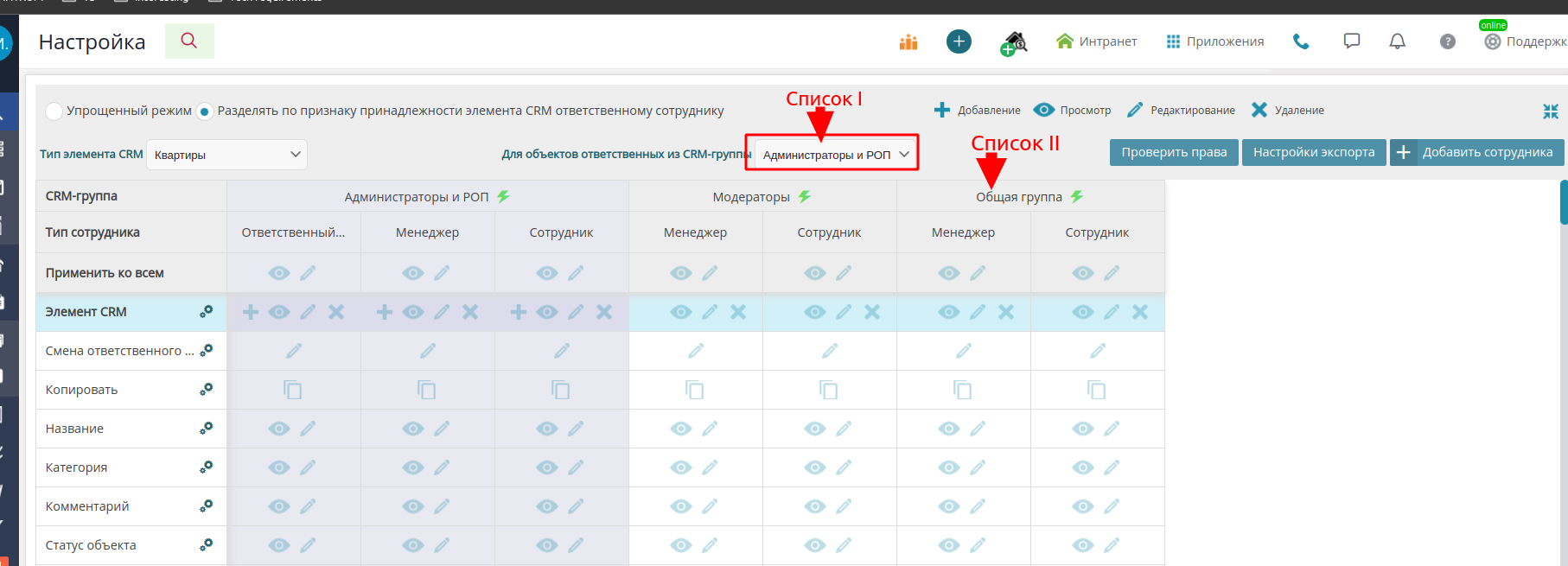 Сначала нужно выбрать группу из СПИСКА I. В данной таблице приведены настройки прав доступа к объектам CRM, добавленным именно этой группой сотрудников, которая является объектом применения прав.