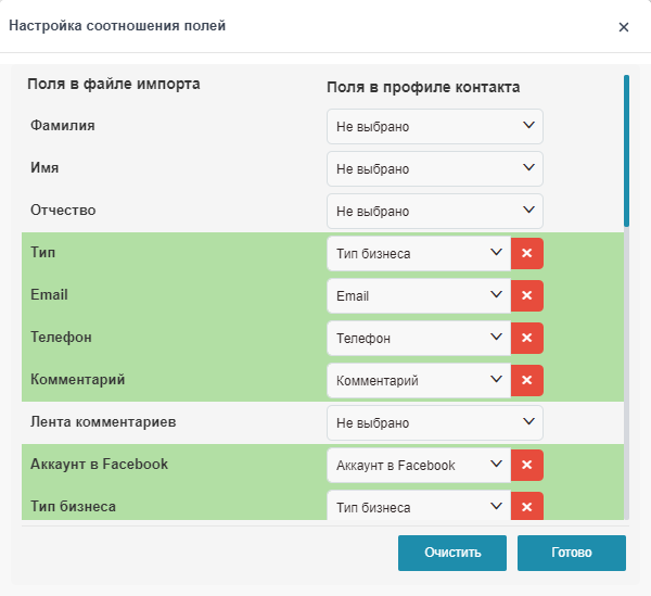 На следующей странице вы можете настроить соответствия между столбцами файла Excel и полями в профиле контакта: