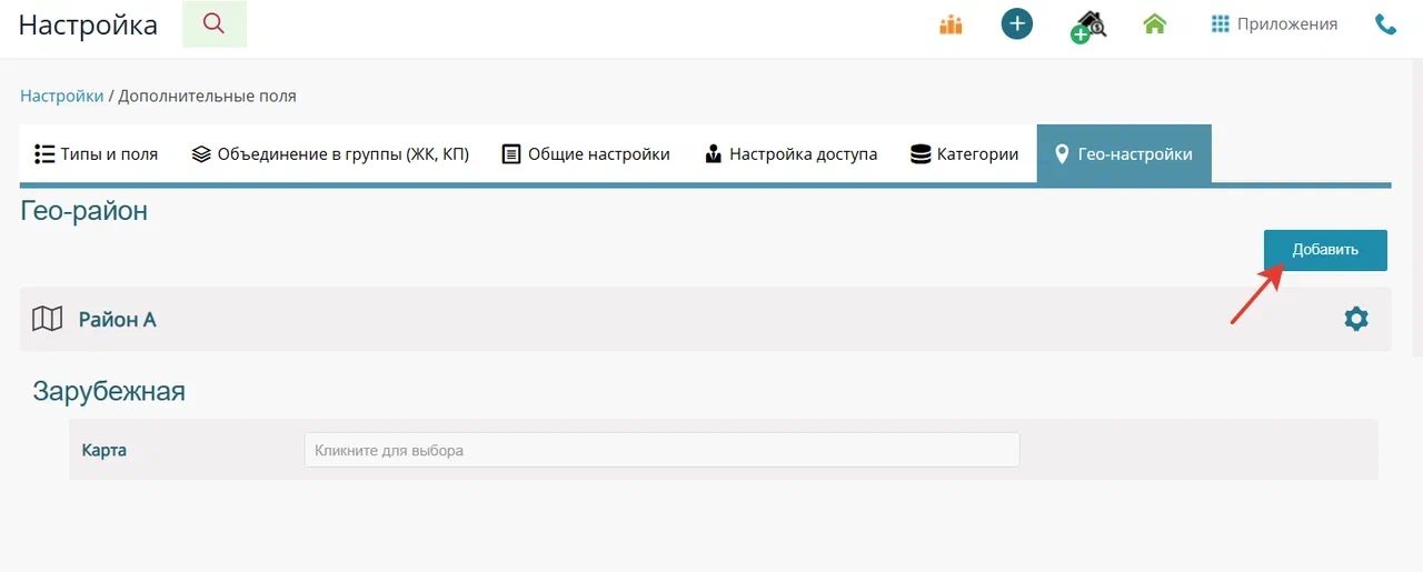 Помимо тех районов города, которые присутствуют в системе, вы можете добавить собственные конфигурации райнов для отображений их на карте. Это можно сделать в Меню - Настройки - CRM - Объекты - вкладка Гео-настройки