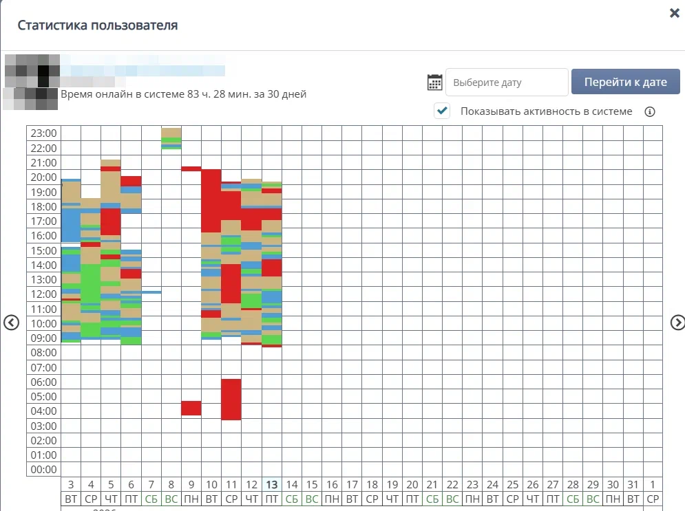 В HR-панели существует возможность просмотра информации по активности сотрудников: моменты входа и выхода из системы, а также время нахождения онлайн.