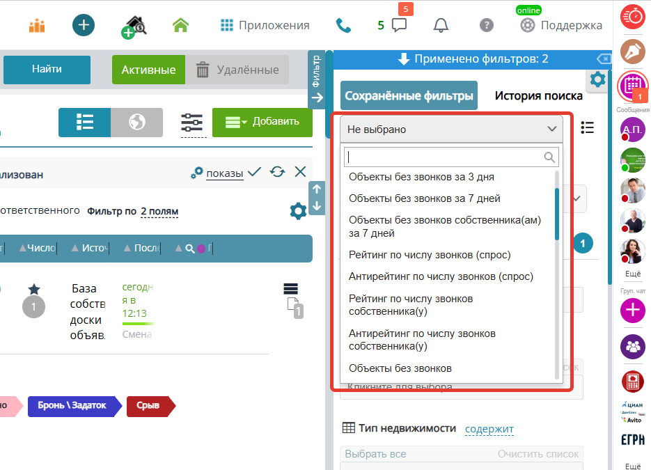 На странице Объектов и Заявок есть возможность выбрать заранее предустановленные быстрые фильтры для удобной выборки по наиболее популярным и полезным критериям.