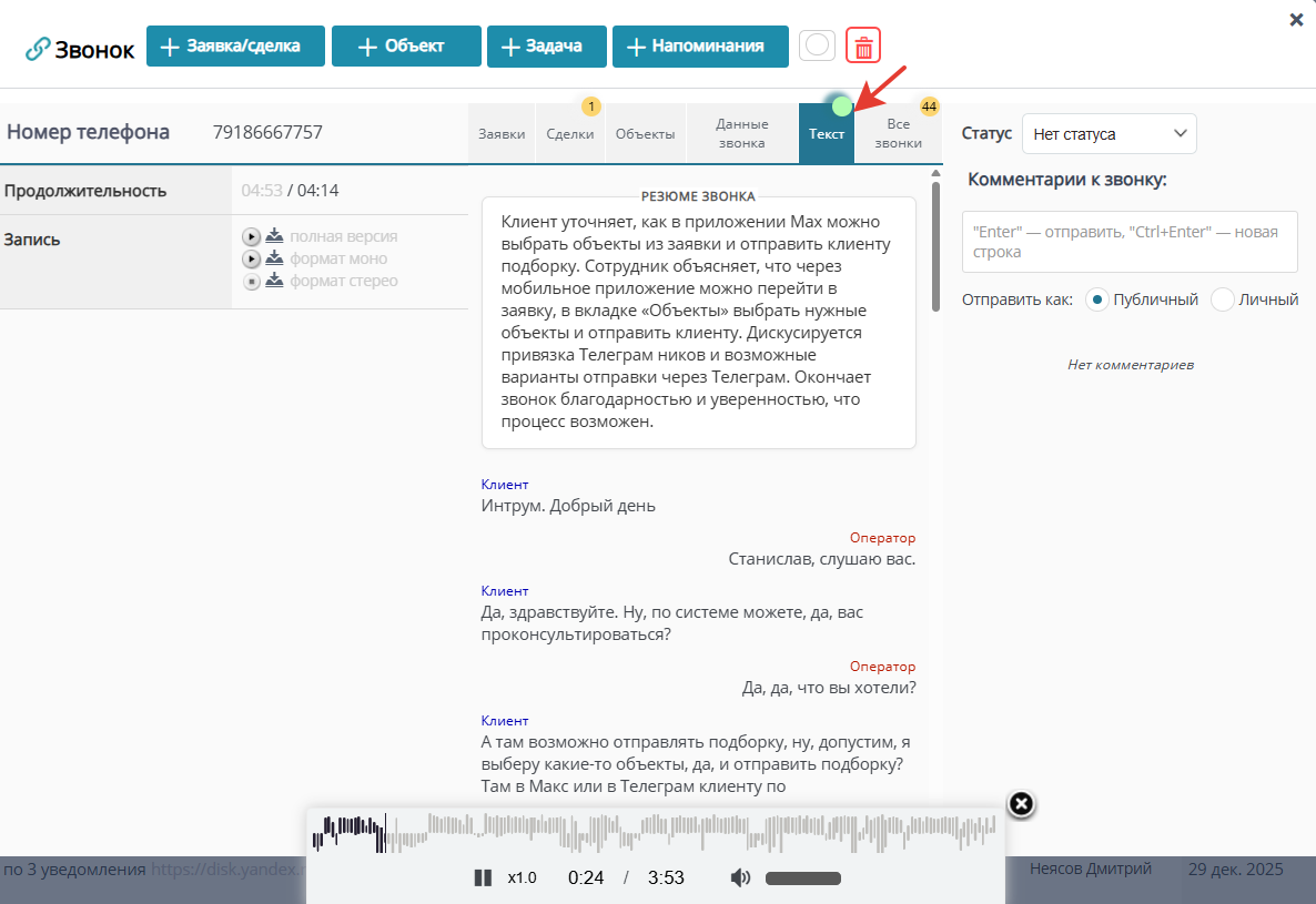 Все записи разговоров входящих, исходящих, а также внутренних вызовов по умолчанию транскрибируются в текст. Другими словами, в карточке звонка во вкладке "Текст" Вы можете увидеть текстовую расшифровку звонка в виде чата Клиент-Оператор.