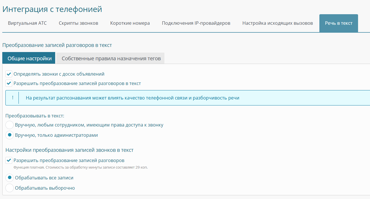 2) автоматический - система будет обрабатывать поступающий звонки. Эта опция платная - см. цены. Какие именно звонки нужно обрабатывать (фильтр по линиям, сотрудникам, отделам) - вы можете гибко настроить в разделе Главное меню - Настройка - Интеграции - Телефония - вкладка "Речь в текст"